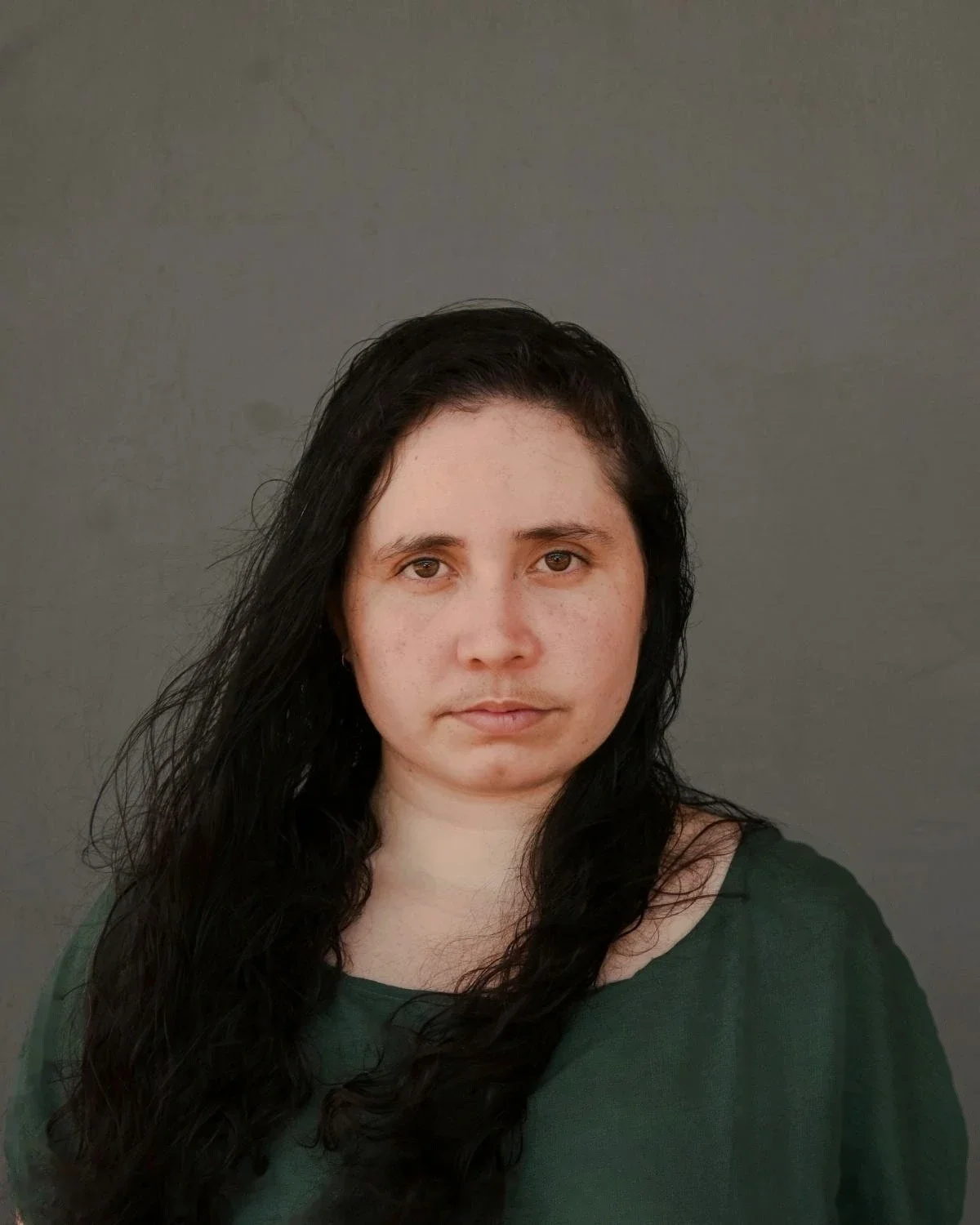 Close-up portrait of a young man with long, curly black hair, wearing a black shirt, smiling subtly, against a brown background.