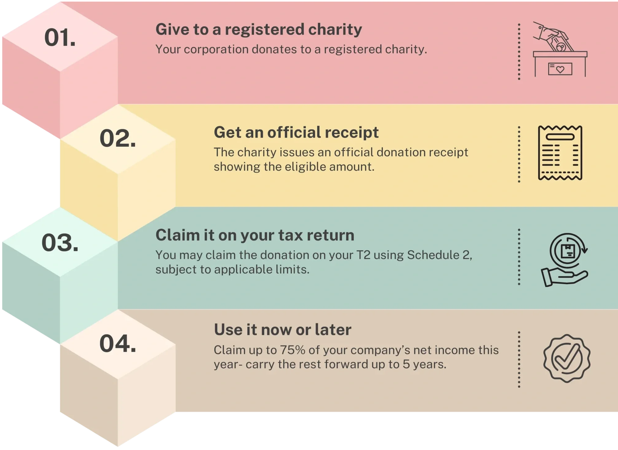 The charity provides an official donation receipt. When the business prepares its taxes, this receipt is recorded as part of normal financial reporting.